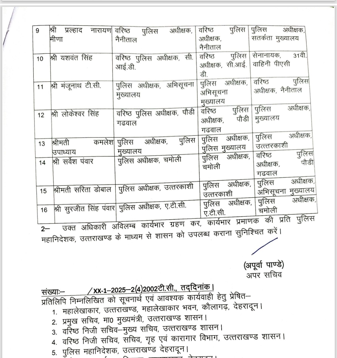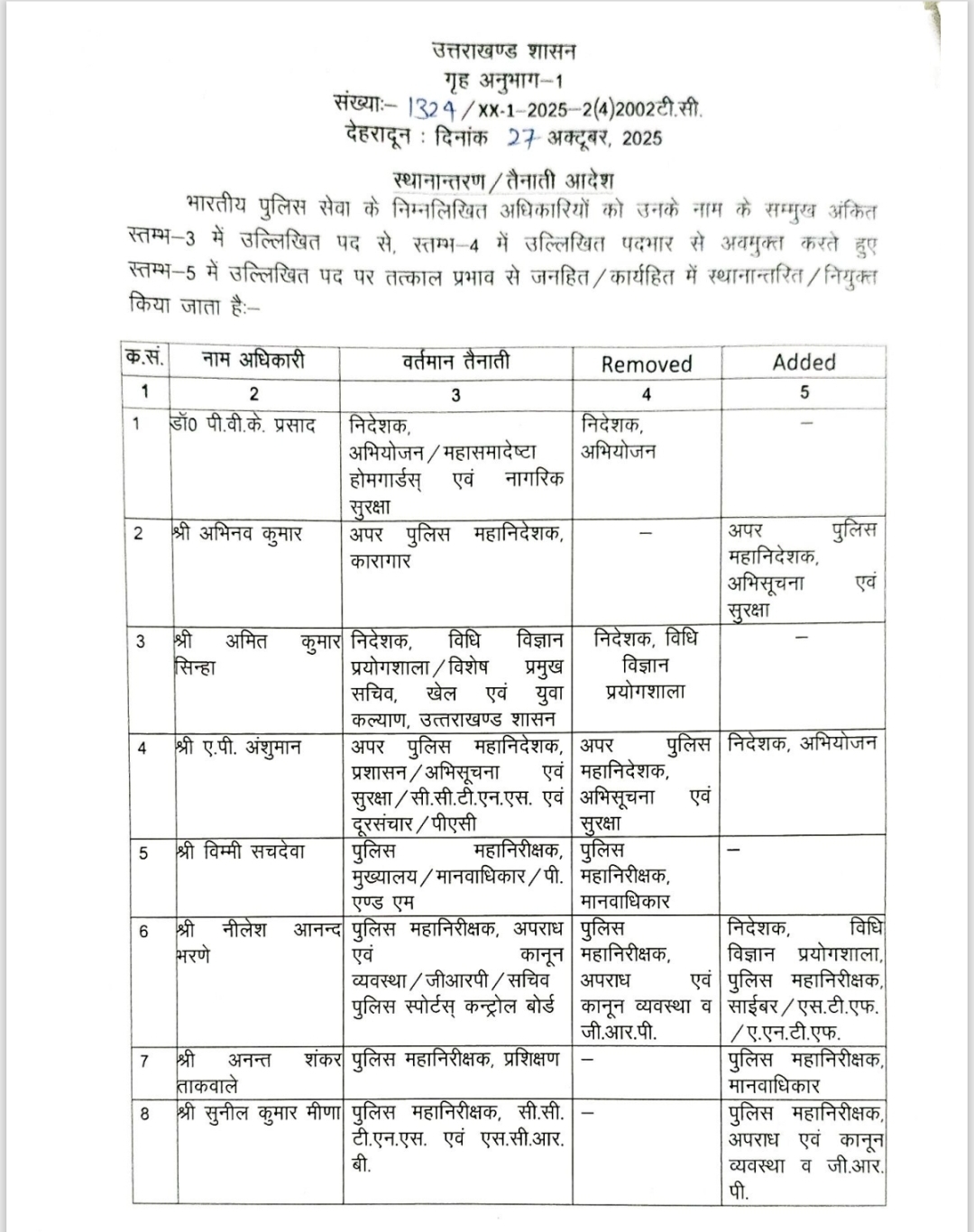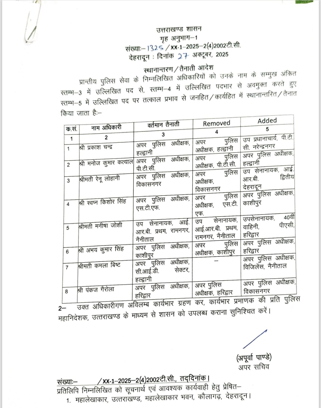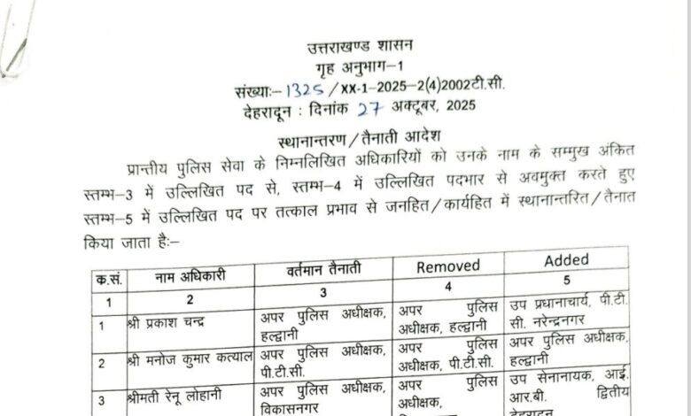 Home/Uncategories/उत्तराखंड में 16 IPS और 8 PPS अधिकारियों का तबादला Uncategories उत्तराखंड में 16 IPS और 8 PPS अधिकारियों का तबादला सरकार ने कुछ जिलों के कप्तान भी बदले Web Editor Send an email 1 hour agoLast Updated: October 27, 20250 Less than a minute Tags16 IPS 8 PPS officers transferred Uttarakhand Web Editor Send an email 1 hour agoLast Updated: October 27, 20250 Less than a minute