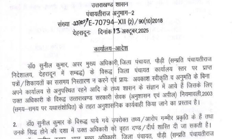 शासन की बड़ी कार्रवाई, पौड़ी जिला पंचायत के अपर मुख्य अधिकारी निलंबित