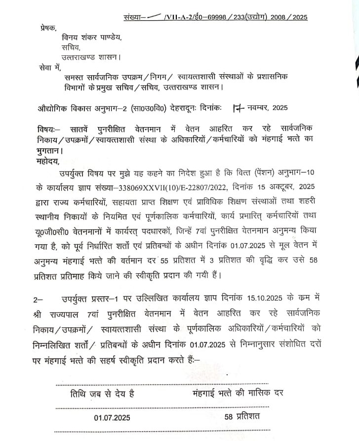 देहरादून। मुख्यमंत्री पुष्कर सिंह धामी के नेतृत्व में राज्य सरकार ने कर्मचारियों को बड़ी राहत देते हुए महंगाई भत्ते (DA) में 3 प्रतिशत की वृद्धि को मंजूरी दे दी है। सातवें पुनरीक्षित वेतनमान में वेतन आहरित कर रहे सार्वजनिक निकायों, उपक्रमों व स्वायत्तशासी संस्थाओं के अधिकारियों–कर्मचारियों के लिए DA को 55% से बढ़ाकर 58% किए जाने का निर्णय लिया गया है। नई दरें 1 जुलाई 2025 से लागू होंगी।