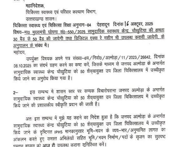देहरादून। अल्मोड़ा जनपद में स्वास्थ्य सेवाओं को विस्तार देते हुये राज्य सरकार ने सामुदायिक स्वास्थ्य केन्द्र चौखुटिया को उप जिला चिकित्सालय में उच्चीकृत कर दिया है। जिसकी प्रशासकीय स्वीकृति देते हुये शासनादेश जारी कर दिया गया है। इसके साथ ही अस्पताल में आईपीएचएस मानकों के अनुरूप चिकित्सकों एवं मेडिकल स्टॉफ की नियुक्ति के साथ ही डिजिटल एक्स-रे मशीन व अन्य आवश्यक चिकित्सा उपकरणों की आपूर्ति की जायेगी। जिस हेतु स्वास्थ्य महानिदेशक को यथाशीध्र प्रस्ताव शासन को उपलब्ध कराने के निर्देश भी दे दिये गये हैं।