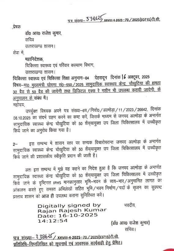 चिकित्सा स्वास्थ्य एवं चिकित्सा शिक्षा मंत्री डॉ. धन सिंह रावत ने बताया कि प्रदेश में चिकित्सा सेवाओं के विस्तार व आम लोगों को बेहतर उपचार सुनिश्चित करने के लिये राज्य सरकार लगातार प्रयासरत है। सरकार ने जन अपेक्षाओं के अनुरूप अल्मोड़ा जनपद के चौखुटिया और आसपास के ग्रामीण क्षेत्रों में उच्च स्तरीय चिकित्सा सुविधाएं उपलब्ध कराने के दृष्टिगत 30 शैय्यायुक्त सामुदायिक स्वास्थ्य केन्द्र चौखुटिया को 50 शैय्यायुक्त उप जिला चिकित्सालय में उच्चीकृत कर दिया है। जिसका शासनदेश जारी कर विभागीय अधिकारियों को अस्तपाल के विस्तार की प्रक्रिया शीघ्र पूरा करने के निर्देश दिये हैं।