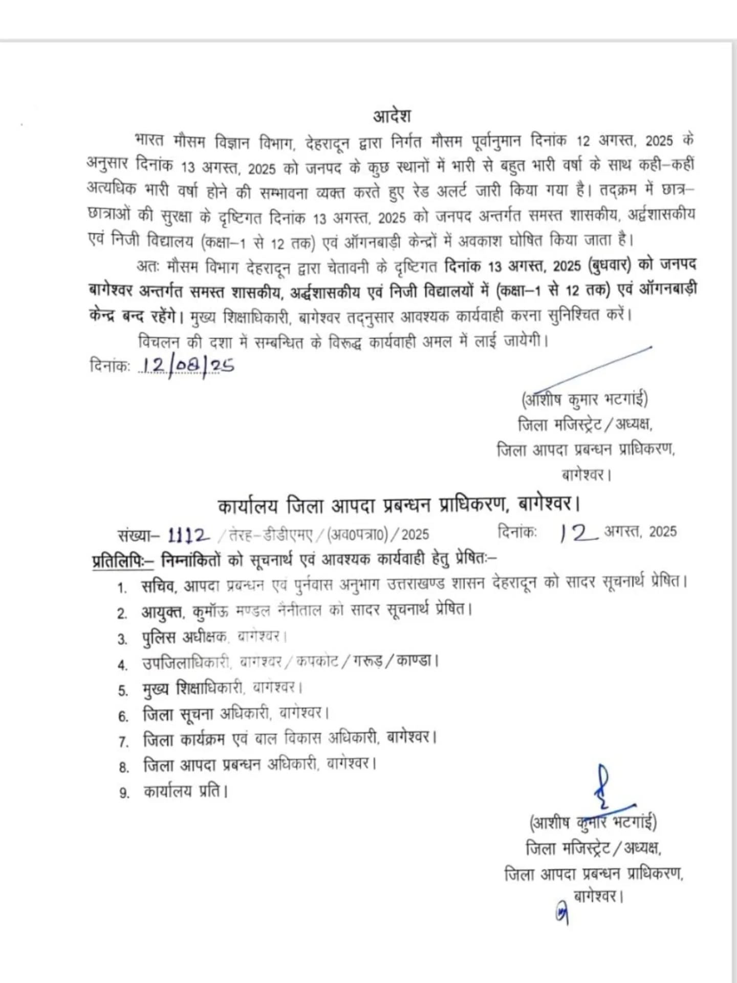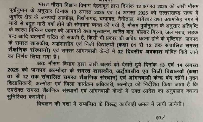 अल्मोड़ा/बागेश्वर। मौसम विज्ञान केंद्र, देहरादून की ओर से जारी भारी बारिश के पूर्वानुमान के दृष्टिगत अल्मोड़ा जनपद के सभी (कक्षा 1 से 12वीं तक) विद्यालयों और आंगनबाड़ी केंद्रों में 13 और 14 अगस्त को अवकाश घोषित किया गया है। जबकि, बागेश्वर जनपद में कल 13 अगस्त सभी (कक्षा 1 से 12वीं तक) विद्यालयों और आंगनबाड़ी केंद्रों में अवकाश घोषित किया गया है।