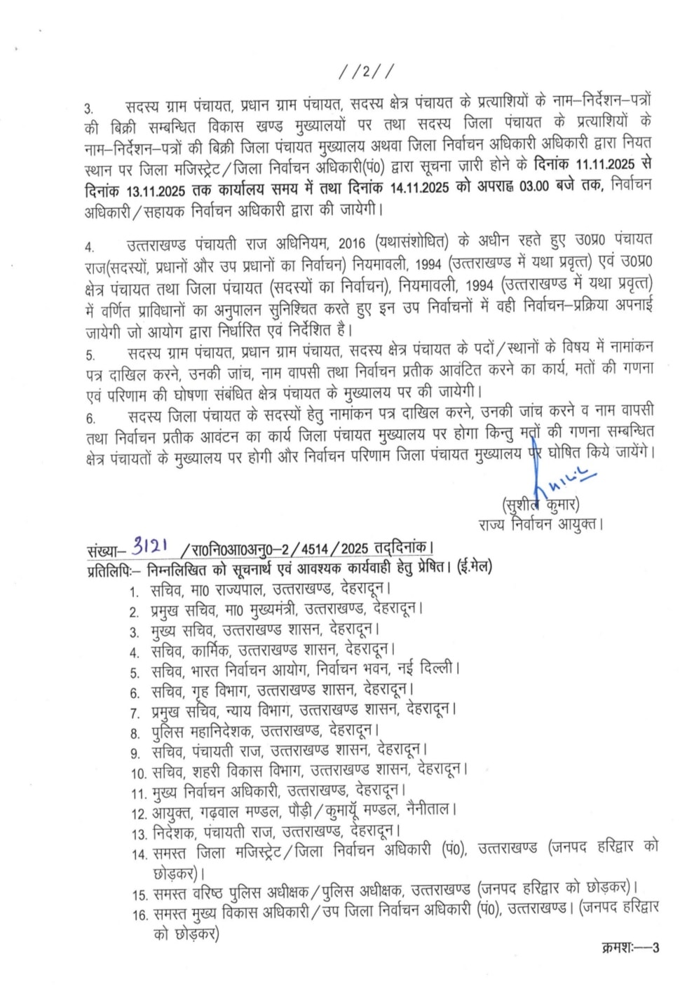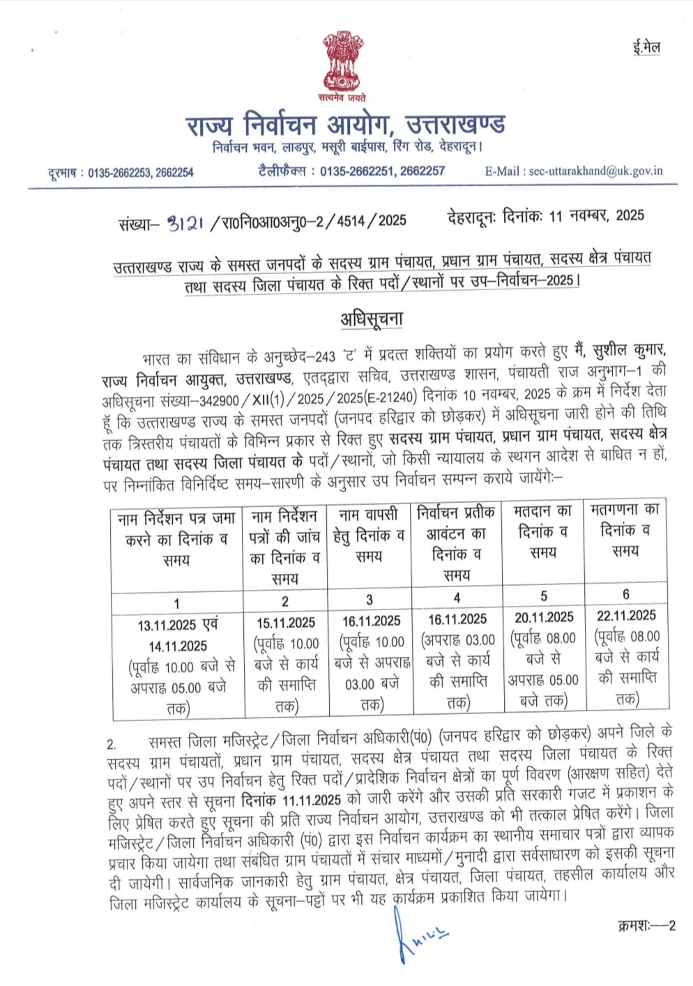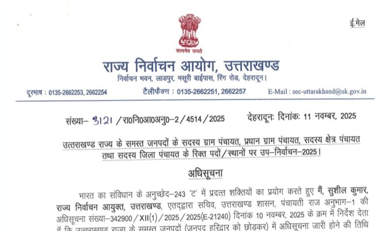 देहरादून। राज्य निर्वाचन आयोग ने त्रिस्तरीय पंचायतों के उपचुनाव की अधिसूचना जारी कर दी है। ग्राम पंचायत सदस्य, ग्राम प्रधान, क्षेत्र पंचायत सदस्य एवं जिला पंचायत सदस्य  के पदों पर उपचुनाव हेतु नाम निर्देशन पत्र 13 व 14 नवम्बर, 2025 को पूर्वाह्न 10 बजे से अपराह्न 5 बजे तक जमा किए जाएंगे।