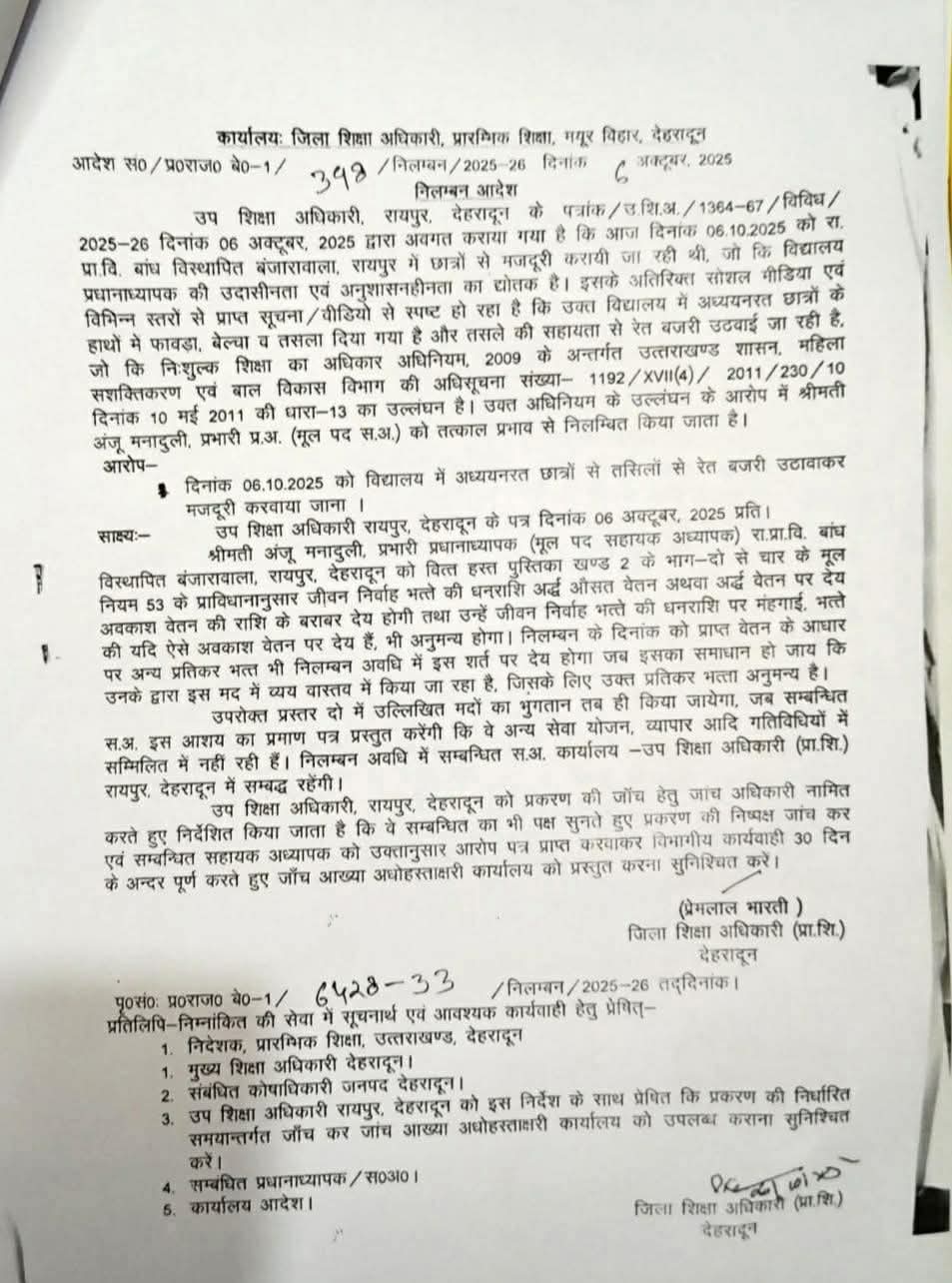 देहरादून। राजकीय प्राथमिक विद्यालय बांध विस्थापित बंजारावाला, देहरादून में छात्रों से बजरी, रेता, मिट्टी ढुलाई कराने संबंधी सोशल मीडिया पर प्रचारित वीडियो का संज्ञान लेते हुए मुख्य शिक्षा अधिकारी ने विद्यालय की प्रधानाचार्य को तत्काल प्रभाव से निलंबित करने का आदेश जारी किया।