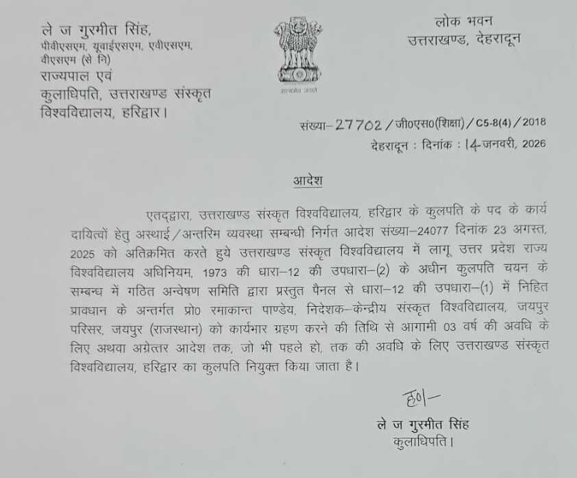 राज्यपाल की ओर से जारी आदेश में कहा गया है कि प्रो. पाण्डेय के आगामी तीन वर्ष की अवधि के लिए अथवा अग्रेत्तर आदेश तक, जो भी पहले हो. तक की अवधि के लिए कुलपति नियुक्त किया जाता है।