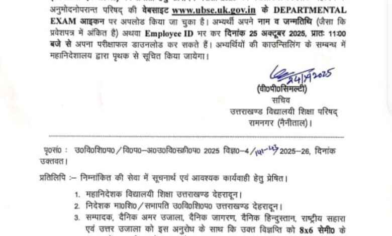 अभ्यर्थी अपने नाम व जन्मतिथि अथवा Employee ID भर कर कल 25 अक्टूबर 2025, प्रातः 11:00 बजे से अपना परीक्षाफल डाउनलोड कर सकते हैं। अभ्यर्थियों को काउन्सिलिंग के सम्बन्ध में महानिदेशालय द्वारा अलग से सूचित किया जायेगा।