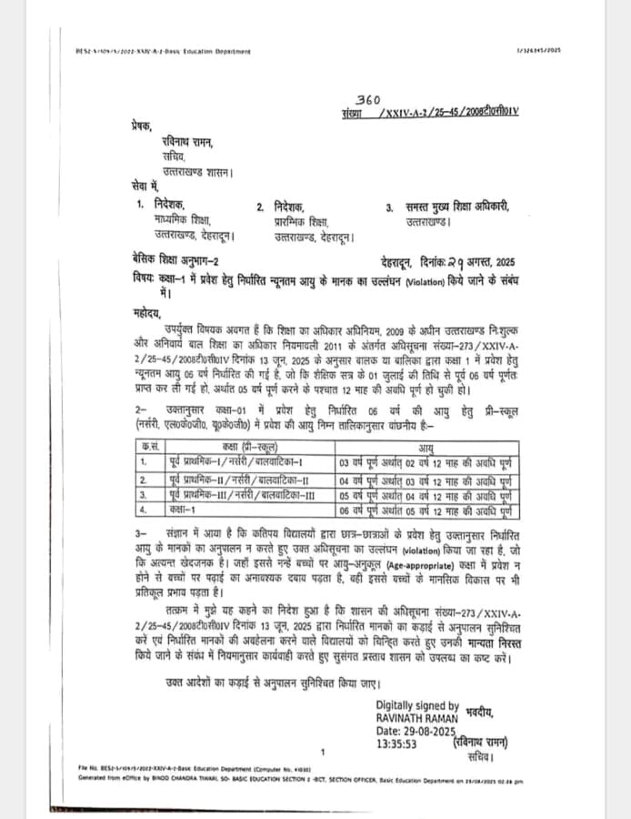 उल्लेखनीय है कि शिक्षा का अधिकार अधिनियम के अंतर्गत कक्षा एक में प्रवेश के लिए न्यूनतम आयु 6 वर्ष निर्धाति की गई। सचिव शिक्षा रविनाथ रमन की ओर से जारी आदेश में कहा गया है कि उनकी संज्ञान में आया है कि कुछ विद्यालयों द्वारा छात्र-छात्राओं के प्रवेश हेतु मानकों का उल्लंघन किया जा रहा है। उन्होंने अधिकारियों को निर्देश दिए कि मानकों का कड़ाई से अनुपालन सुनिश्चित करें और मानकों की अवहेलना करने वाले विद्यालयों के चिन्हित कर उनकी मान्यता निरस्त करने के संबंध में नियमुनासार कार्यवाही करते हुए प्रस्ताव शासन के भेजें।