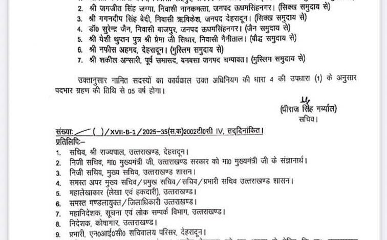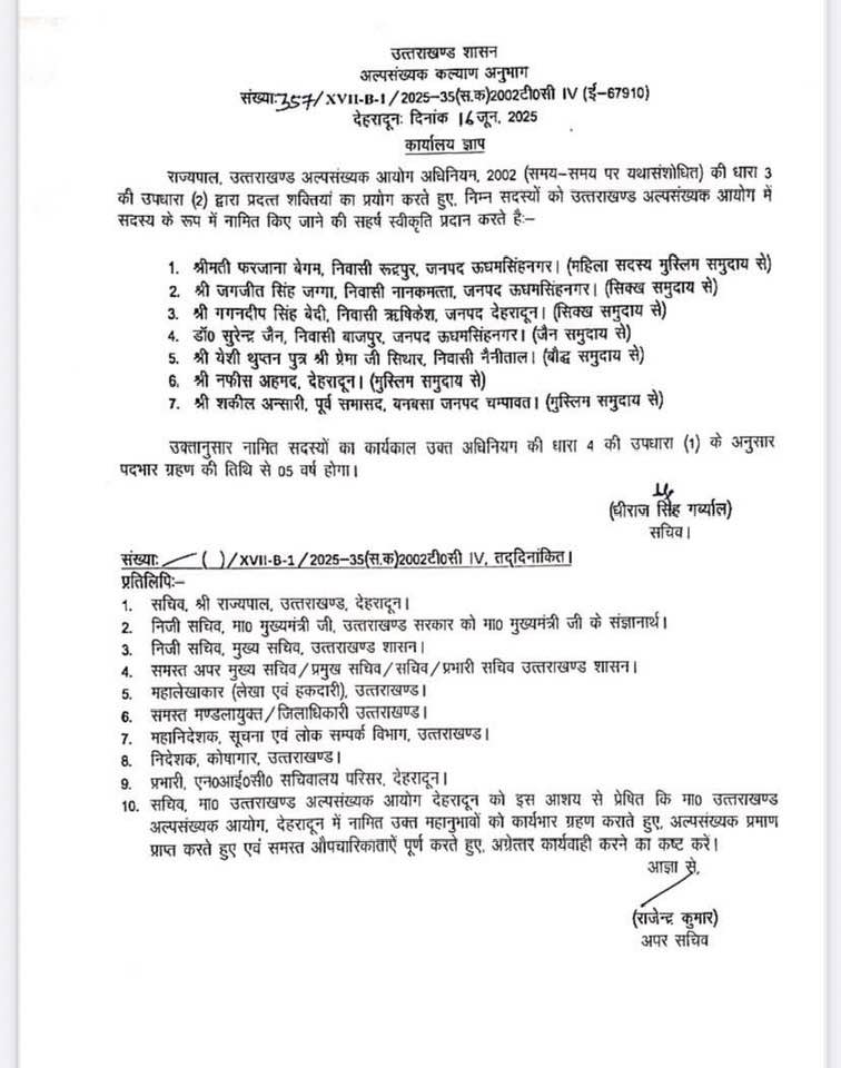 देहरादून। उत्तराखंड सरकार ने अल्पसंख्यक आयोग में सात सदस्य नामित किए हैं। नामित किए गए सदस्यों में तीन मुस्लिम, दो सिख और एक-एक जैन व बोद्ध समुदाय से शामिल हैं।