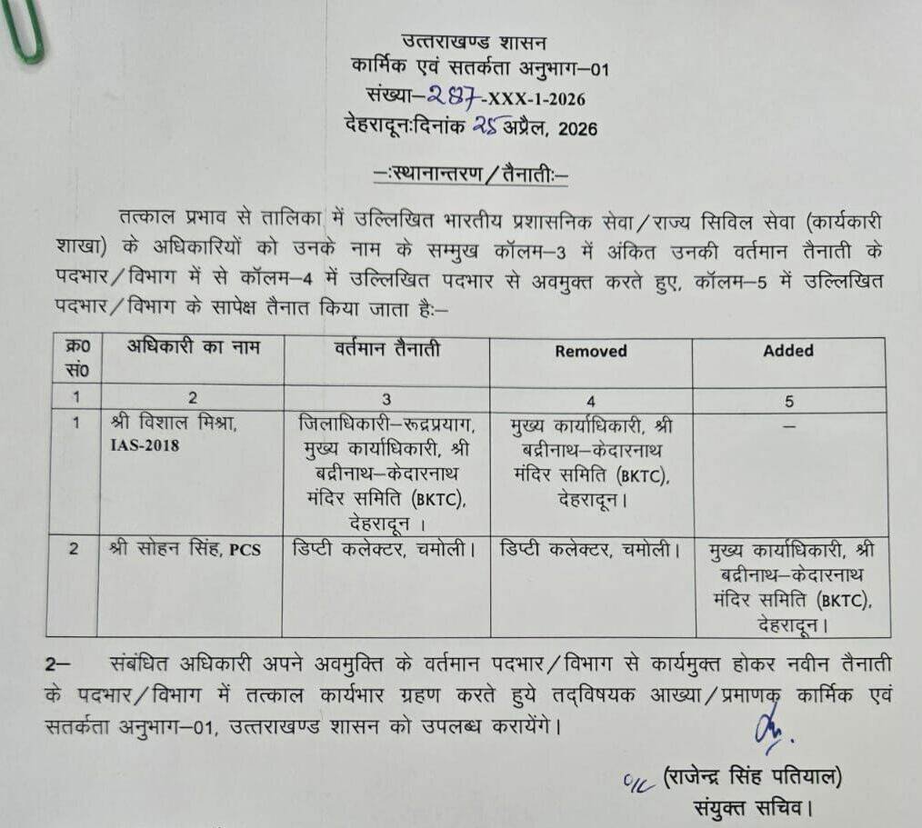 देहरादून। पीसीएस अधिकारी सोहन सिंह को श्री बद्रीनाथ-केदारनाथ मंदिर समिति का मुख्य कार्याधिकारी नियुक्त किया गया है। सोहन सिंह चमोली में डिप्टी कलेक्टर के पद पर तैनात थे।