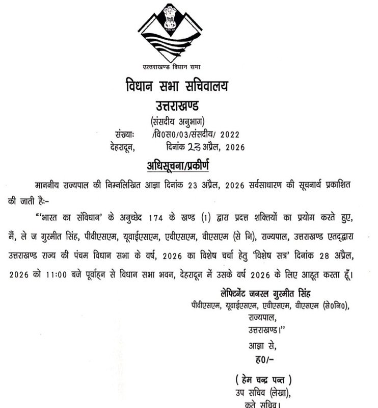 देहरादून। उत्तराखंड विधानसभा का विशेष सत्र 28 अप्रैल को पूर्वाह्न 11 बजे से आहूत किया जाएगा। विधासनसभा सचिवालय की ओर से विशेष सत्र आहूत किए जाने की अधिसूचना जारी कर दी गई है।