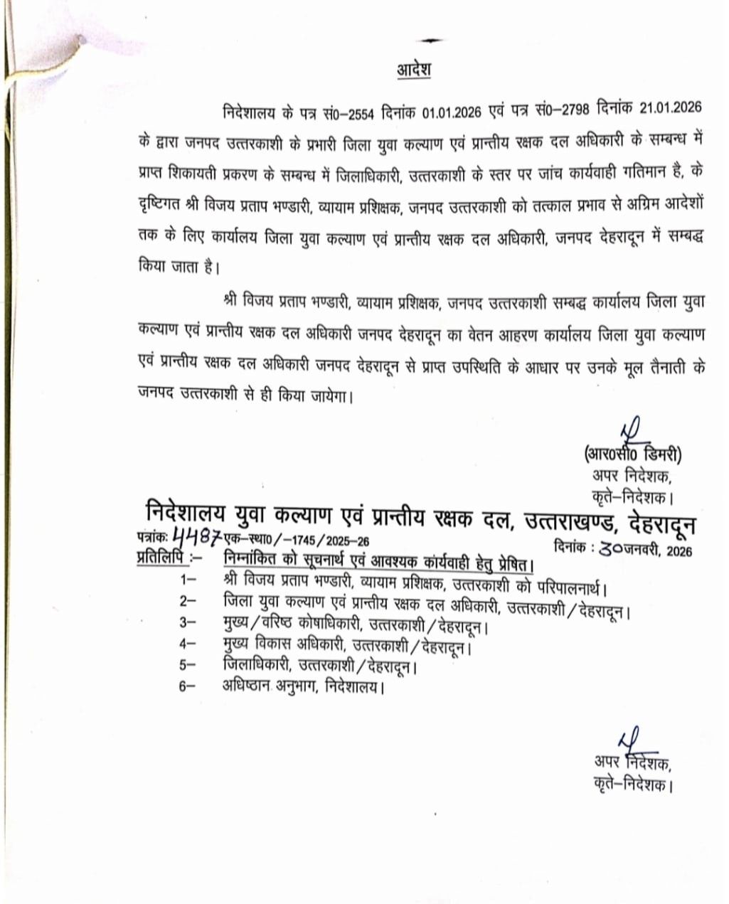 उत्तरकाशी के युवा कल्याण एवं प्रांतीय रक्षक दल विभाग में अनियमित्ता पर सख्त एक्शन