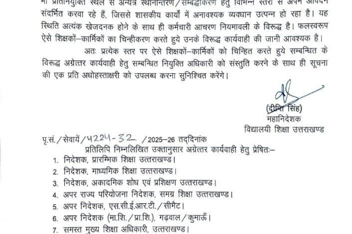 अतः प्रत्येक स्तर पर ऐसे शिक्षकों कार्मिकों को चिन्हित करते हुये सम्बन्धित के विरूद्ध अग्रेत्तर कार्यवाही हेतु सम्बन्धित नियुक्ति अधिकारी को संस्तुति करने के साथ ही सूचना की एक प्रति महानिदेशक को उपलब्ध करना सुनिश्चित करेंगे।
