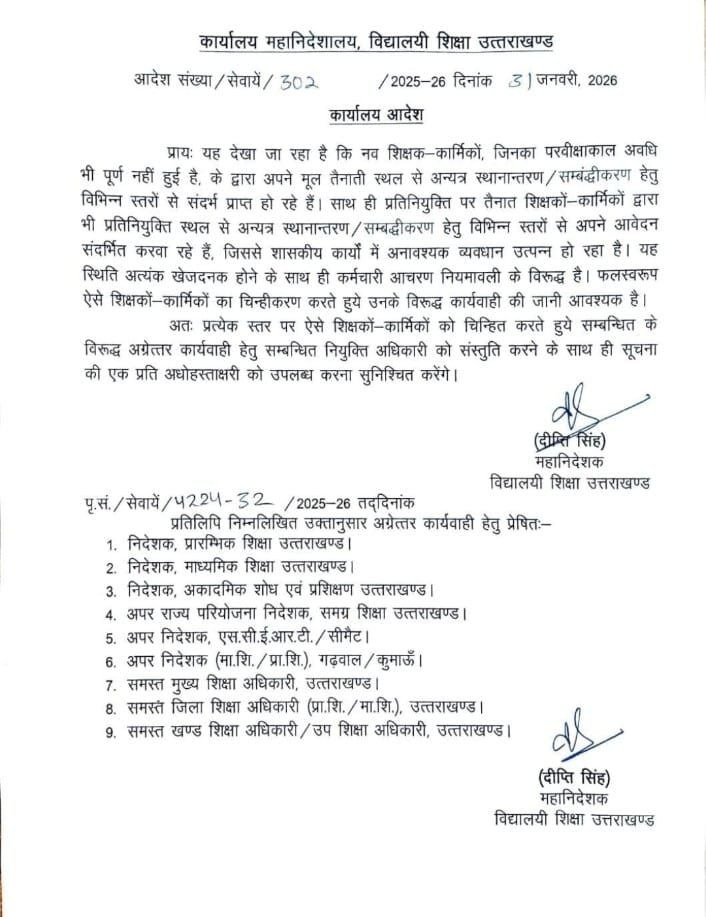 महानिदेशक विद्यालयी शिक्षा दीप्ति सिंह की ओर से जारी आदेश में कहा गया है कि प्रायः यह देखा जा रहा है कि नए शिक्षक-कार्मिकों, जिनका परवीक्षाकाल अवधि भी पूर्ण नहीं हुई है, के द्वारा अपने मूल तैनाती स्थल से अन्यत्र स्थानान्तरण/सम्बंद्धीकरण के लिए विभिन्न स्तरों से सिफारिश की जा रही है। साथ ही प्रतिनियुक्ति पर तैनात शिक्षकों-कार्मिकों द्वारा भी प्रतिनियुक्ति स्थल से अन्यत्र स्थानान्तरण/सम्बद्धीकरण हेतु विभिन्न स्तरों से अपने आवेदन संदर्भित करवा रहे हैं, जिससे शासकीय कार्यों में अनावश्यक व्यवधान उत्पन्न हो रहा है। यह स्थिति अत्यंक खेजदनक होने के साथ ही कर्मचारी आचरण नियमावली के विरूद्ध है। ऐसे शिक्षकों-कार्मिकों का चिन्हीकरण करते हुये उनके विरूद्ध कार्यवाही की जानी आवश्यक है।