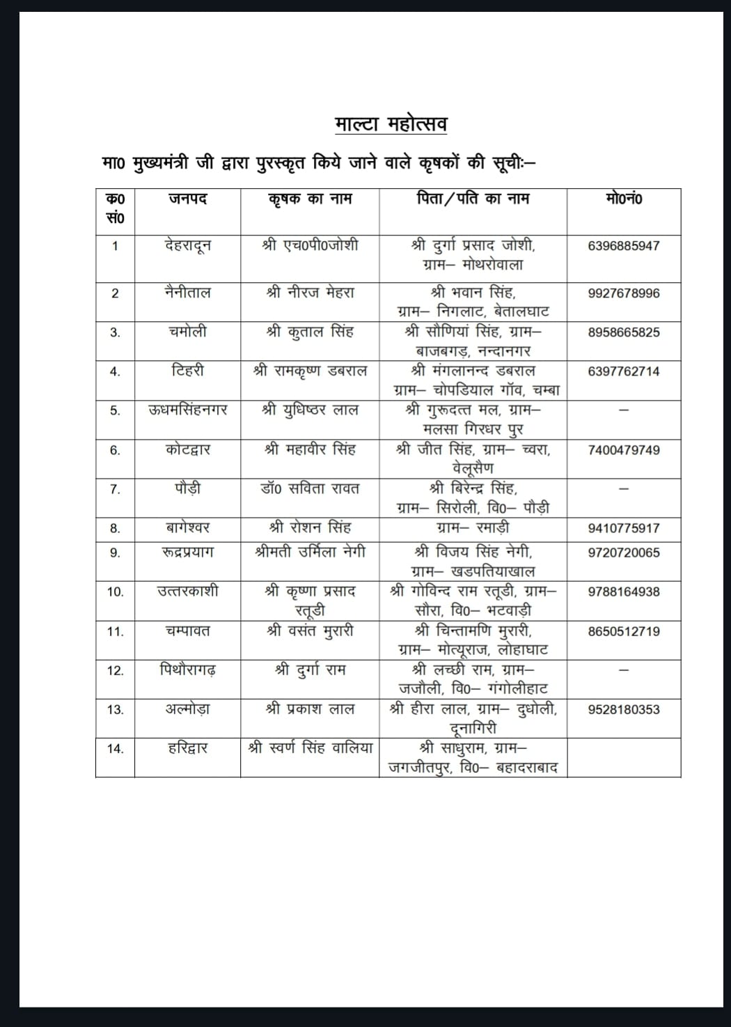 मुख्यमंत्री ने माल्टा महोत्सव में प्रतिभाग करने आए पौड़ी गढ़वाल के माल्टा उत्पादक हरीश के प्रयासों की सराहना करते हुए बताया कि उन्होंने 53 प्रजातियों के लगभग एक हजार पौधे रोपित किए हैं तथा इस बार भी 200 पौधे रोपित करने की तैयारी कर रहे हैं। मुख्यमंत्री ने अन्य किसानों को इनसे र्प्रेरणा लेकर बागवानी के क्षेत्र में विद्यमान संभावनाओं को साकार करने में सरकार के प्रयासों को सफल बनाने का आह्वान किया।