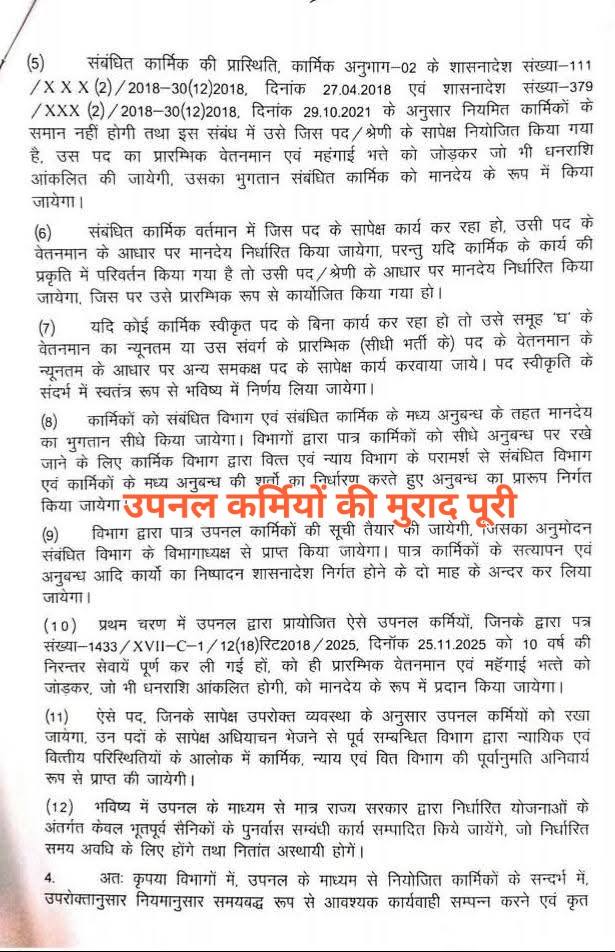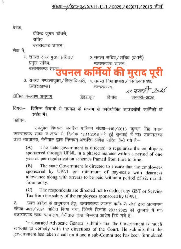सचिव दीपेंद्र कुमार चौधरी की ओर से जारी आदेश में कहा गया है कि उपनल कार्मिक जो वर्तमान में जिस पद पर कार्यरत हैं, को उस पद के सापेक्ष वेतनमान का न्यूनतम एवं महंगाई भत्ता दिए जाने के लिए उच्च न्यायालय नैनीताल जनहित याचिका में पारित आदेश की तिथि 12 नवंबर 2018 को पात्रता की कट ऑफ डेट मानी जाएगी।