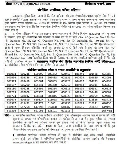 उत्तराखण्ड PCS-J परीक्षा-2023 का संशोधित प्रारम्भिक परीक्षा परिणाम घोषित