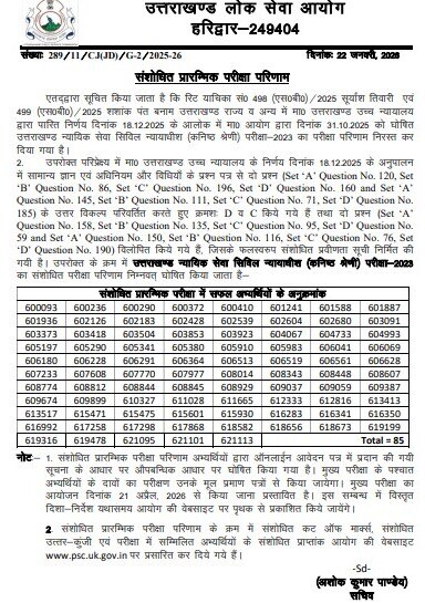 देहरादून। उत्तराखंड लोक सेवा आयोग ने उत्तराखण्ड न्यायिक सेवा सिविल न्यायाधीश (कनिष्ठ श्रेणी) परीक्षा-2023 का संशोधित प्रारम्भिक परीक्षा परिणाम घोषित कर दिया है।