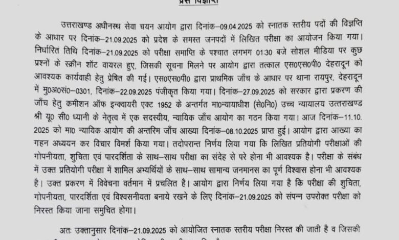 इससे पहल आज सुबह 21 सितंबर, 2025 को आयोजित प्रतियोगी परीक्षा में कथित अनियमितताओं की जांच हेतु राज्य सरकार द्वारा गठित एकल सदस्यीय जांच आयोग ने आज मुख्यमंत्री पुष्कर सिंह धामी से भेंट कर अंतरिम रिपोर्ट प्रस्तुत की। आयोग की अध्यक्षता न्यायमूर्ति (सेवानिवृत्त) यू.सी. ध्यानी द्वारा की गई।
