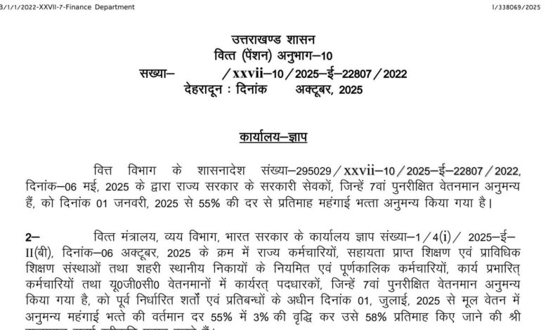 देहरादून। मुख्यमंत्री पुष्कर सिंह धामी के अनुमोदन के बाद राज्य कर्मचारियों, सहायता प्राप्त शिक्षण एवं प्राविधिक शिक्षण संस्थाओं तथा शहरी स्थानीय निकायों के नियमित एवं पूर्णकालिक कर्मचारियों, कार्य प्रभारित् कर्मचारियों तथा यू०जी०सी० वेतनमानों में कार्यरत् पदधारकों, जिन्हें 7वां पुनरीक्षित वेतनमान अनुमन्य किया गया है, को पूर्व निर्धारित शर्तों एवं प्रतिबन्धों के अधीन 01 जुलाई, 2025 से मूल वेतन में अनुमन्य महंगाई भत्ते की वर्तमान दर 55% में 3% की वृद्धि कर उसे 58% किया गया है।