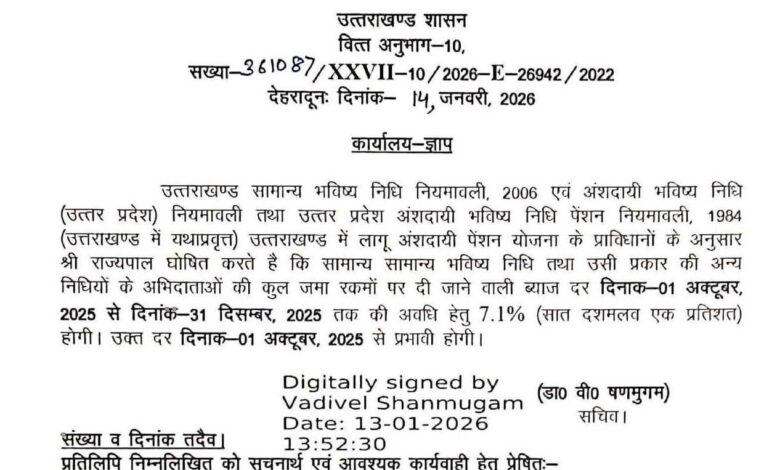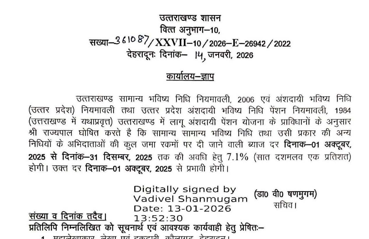 उत्तराखंड सरकार के कर्मचारियों को पीएफ की जमा राशि पर मिलेगा 7.1 प्रतिशत ब्याज