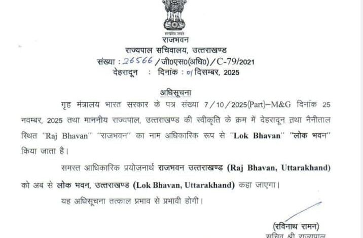 देहरादून। देहरादून और नैनीताल स्थित राजभवन का नाम अब लोक भवन कर दिया गया है। सोमवार को शासन ने इसकी अधिसूचना जारी कर दी है। समस्त आधिकारिक प्रयोजनार्थ राजभवन उत्तराखंड को अब से लोक भवन कहा जाएगा।